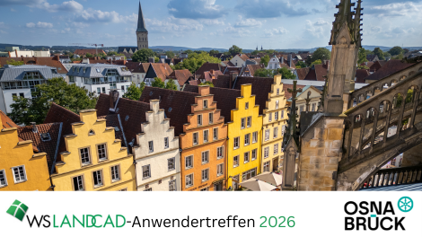 Mehr erfahren: WS LANDCAD-Anwendertreffen 2026Die Stadt Osnabrück lädt die Anwenderschaft von WS LANDCAD und uns ein, das WS LANDCAD-Anwendertreffen 2026 in Osnabrück abzuhalten. Die Organisation ist in vollem Gange und hier lesen Sie bald weiteres zum Event, zum Rahmenprogramm und der Anmeldung.